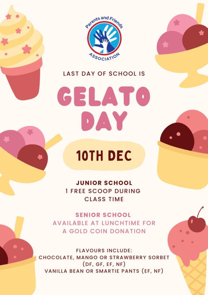 As a thank you, the Parents and Friends Association is providing a Gelato Day for the whole College on the last day of school (10 December). Junior School students will each enjoy a scoop in class, while Senior School students will use the event as a fundraiser for one of the many charities they are supporting, with gelato available for a gold coin donation.