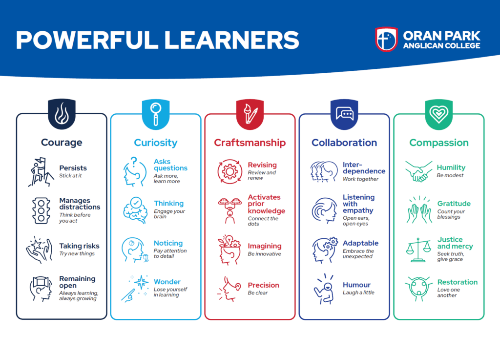 Beneath each value are the learner dispositions. These are the specific actions, mindsets and habits that help students understand how to live these values daily. Whether it is persisting through challenges, asking thoughtful questions, imagining new possibilities, listening with empathy or practising humility and gratitude, these dispositions give students a shared language for understanding themselves as learners.